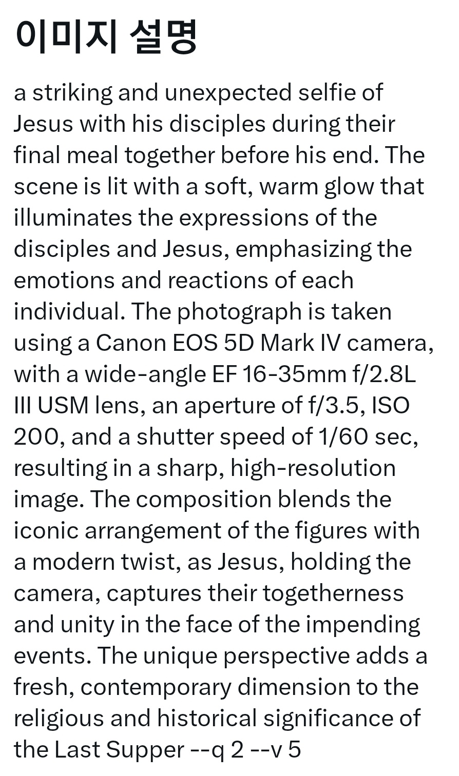 프롬프트에 카메라 렌즈 및 구도까지 작성되어 있는 게 인상 깊다. 사람은 당연하게, 또는 다년간 쌓인 노하우 등으로 본능적으로 사용되는 기술을 AI에게는 하나하나 가르쳐야 한다는 것이 언뜻 보면 번거롭기도 하다. 그러나 그 결과물이 인간이 만들 수 있는 한계를 뛰어 넘을 때, 어쩌면 차세대 개발 방식의 태동기를 우리 세대가 맞이한 게 아닌가 하는 생각도 든다.