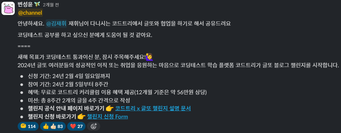 유료인 코드트리 커리큘럼을 무료로 이용할 수 있었다. 챌린지 신청을 통해 곧바로 코드트리의 유료 커리큘럼에 대해 자유로이 접근할 수 있었고, 오픈채팅방에서 다른 글또러 분들의 진행 상황을 통해 동기부여를 꾀할 수도 있었다.