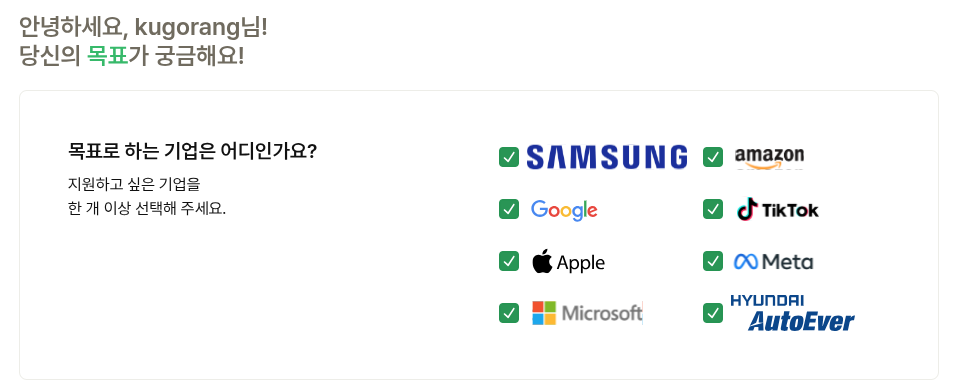 당신이 목표하는 기업은 어디인가요? 이번 개편으로 새로 추가된 기업이다. 기존에는 내 실력이 어느 정도인지는 가늠하는 기능이, "목표 기업 코딩테스트를 위한" 실력 진단으로 조금 더 구체화되어 변경되었다.