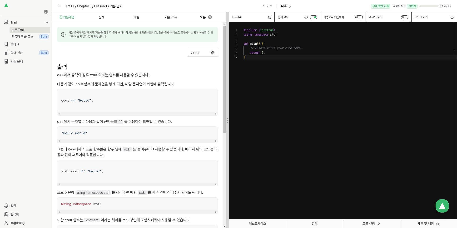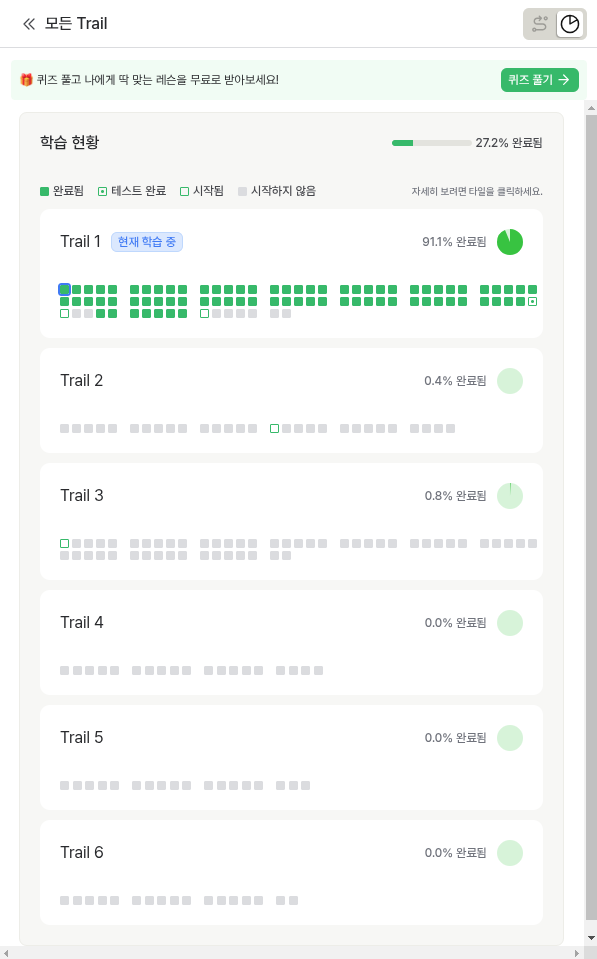 커리큘럼이 트레일(Trail)이라는 용어로 변경되었다. 또한, 문제 풀이 도중에 모든 Trail에 대한 정보를 한 눈에 확인 가능해졌다. 또한, 오늘의 학습 목표와 트레일(Trail, 구 커리큘럼)에 대한 가시성도 보다 좋아졌다. UX적으로 진입과 동시에 오늘의 학습 목표를 날마다 설정 가능하게 한 점과, 교육 과정별로 내가 어느 정도의 진도률을 진행했는지에 대해 전반적인 진행 상황을 확인 가능하게 한 점은 좋았다.