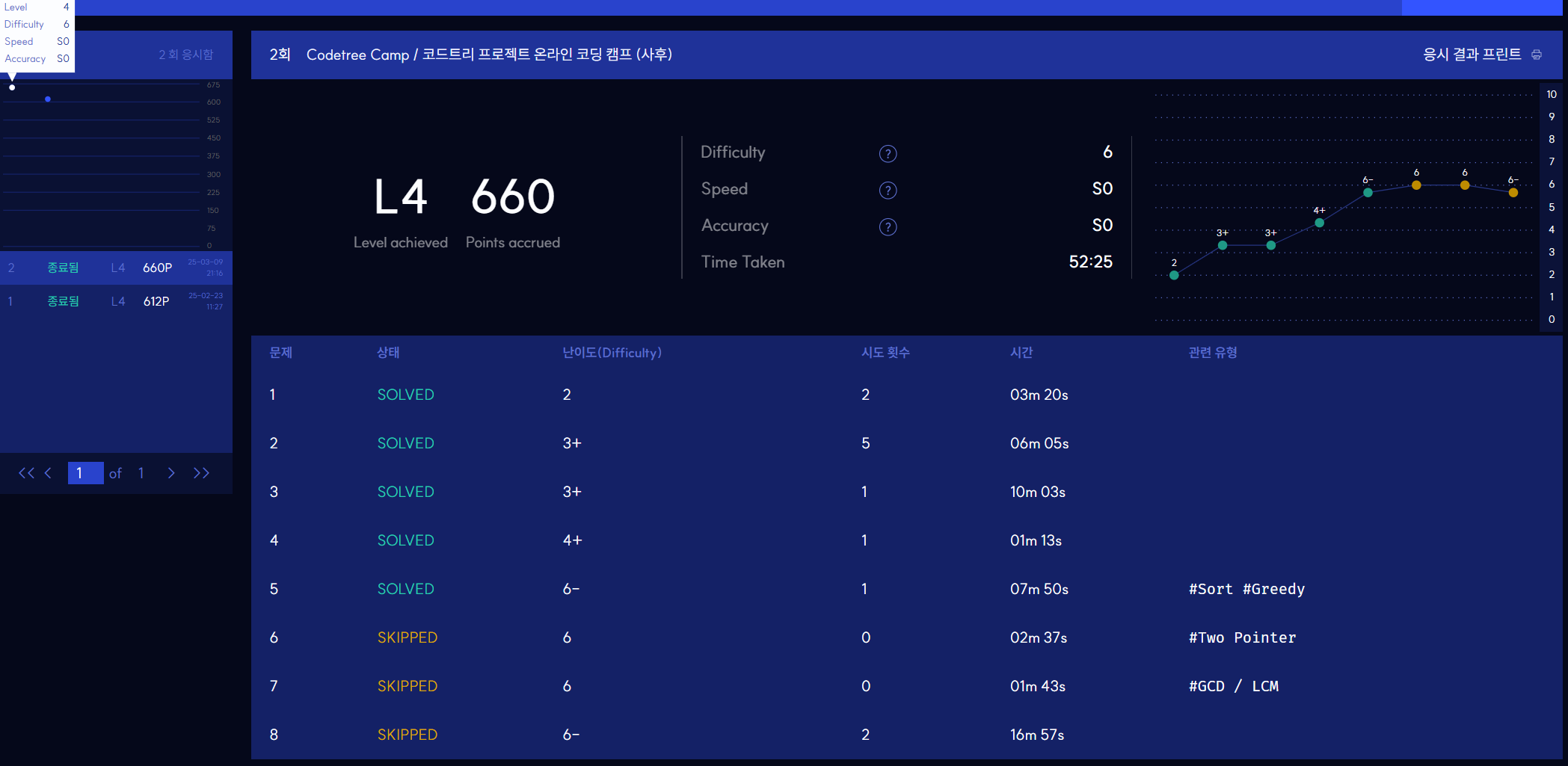 온라인 코딩캠프 전과 후. 이제 코딩테스트 문제에 대한 감을 얼추 잡은 게 점수에 반영된 것 같다. 마지막 날이라 COEIC 사후 테스트를 수행했는데, 점수가 올랐다. 아쉽게도 열심히 준비한 시뮬레이션이나 완전 탐색 문제 유형은 나오지 않았지만 그래도 전반적인 지표 자체가 소폭 상승했다는 것에 의의를 두려고 한다.