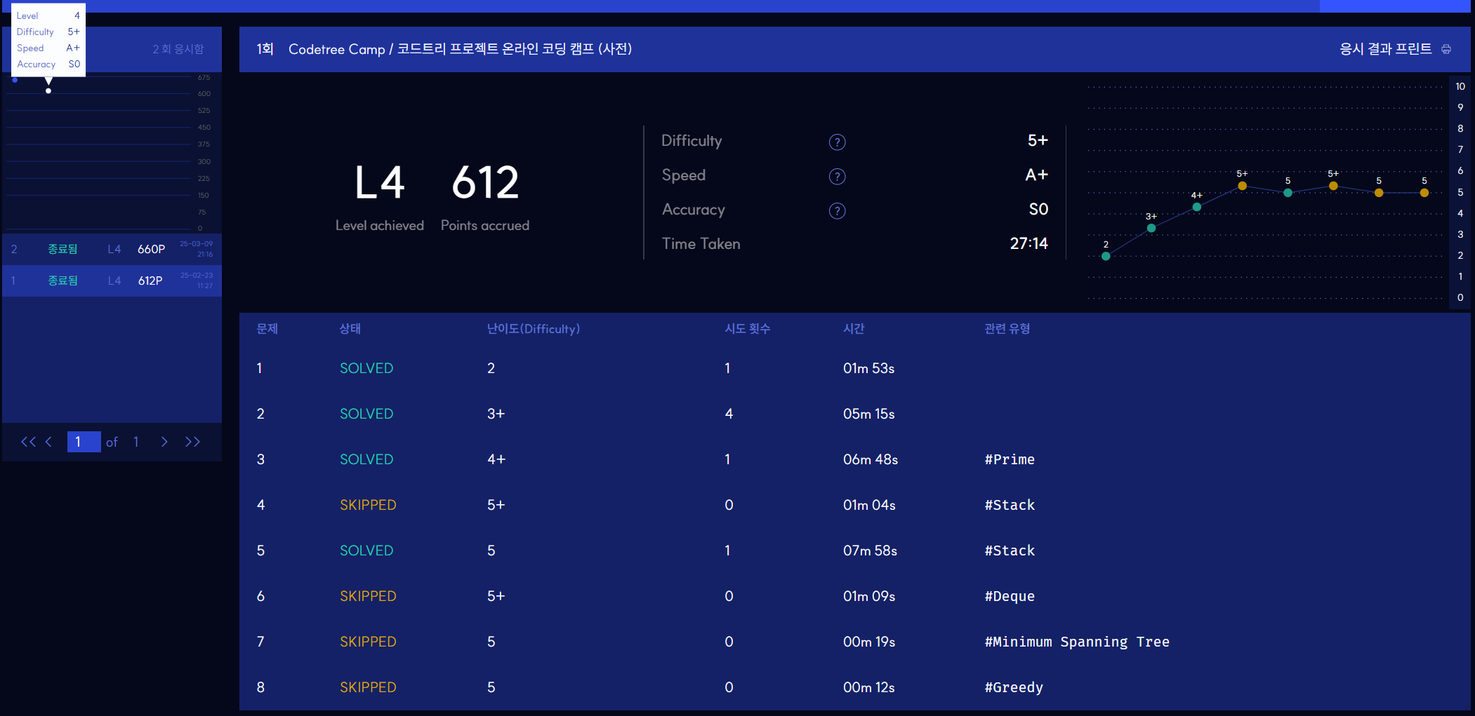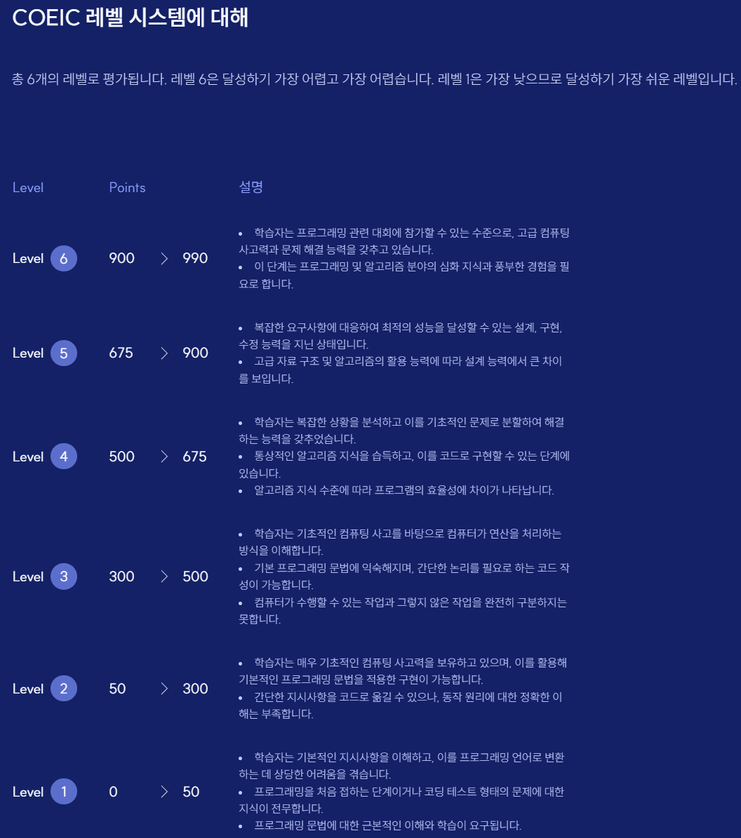 온라인 부트캠프에서 객관적으로 내 실력을 평가할 수 있는 기회도 주어졌었다. COEIC이라는 코딩테스트 시험이었는데, 레벨 시스템이 적용되어 객관적으로 내가 어느 수준인지 알 수 있는 시험이다.