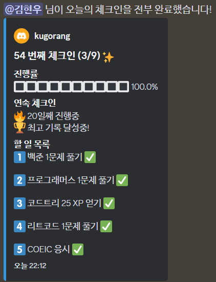 감사하게도 이 프로그램이 시작할 때, 코드트리 측에서 디스코드 서버와 봇을 제작해주셔서 학습에 재미를 붙일 수 있었다. 처음에 공개적인 곳에 무언가를 올리는 게 조금은 낯설기도 하고 부끄럽기도 했는데, 그냥 눈 딱 감고 콤보(?)를 쌓을 겸 봇을 이용했었더니 어느덧 50일이 훌쩍 넘겼다.