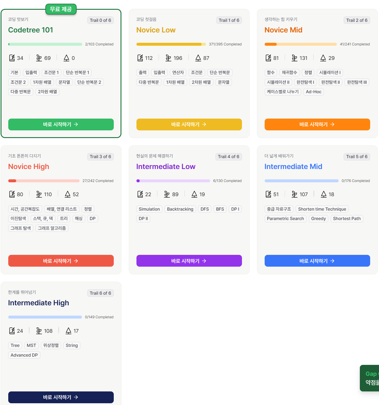 오늘까지 푼 문제들의 기록이다. Novice Low를 다 끝내지 못한 건 조금 아쉽다. Trail은 쉽게 말해 문제집이다. 원래 Trail 0가 없었는데, 이번 기간 동안 프로그래밍 문법부터 연습할 수 있는 `Codetree 101`이 Trail 0로 추가되었다.