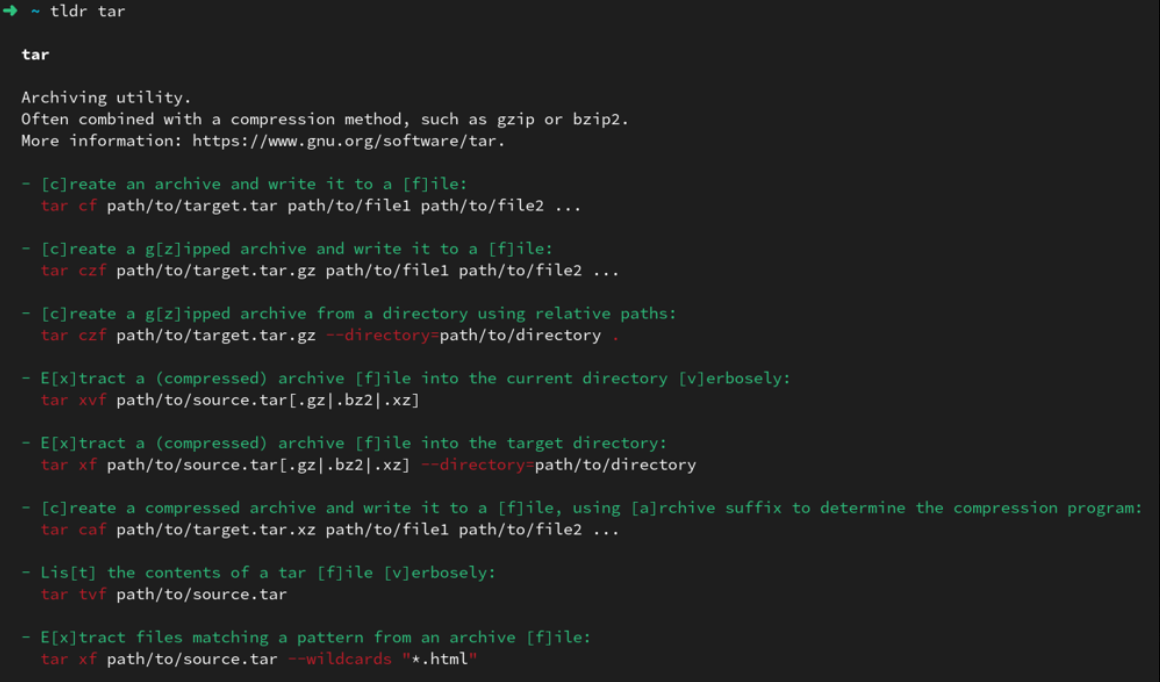 터미널에서 tldr tar 실행 결과 예시. 명령어 설명과 함께 일반적인 활용 예제가 녹색 등의 색상 하이라이트로 표시되어 있다. - 렌더링 방식: 내부적으로 클라이언트는 Markdown 파서를 사용하거나 정규식 등으로 간단히 Markdown 구문을 변환하여 터미널에 출력한다. 리스트 항목의